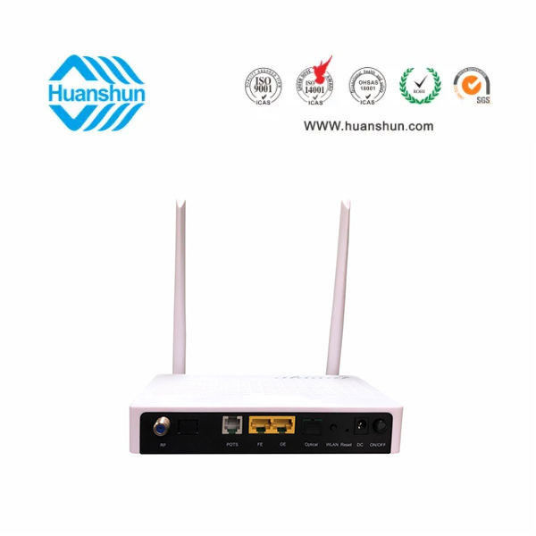 HSOS111762GVNW | G/EPON ONU, PON端口接入,1GE+1FE網(wǎng)絡(luò)接口,1個(gè)POTS 2*2 2.4G WIFI(外置天線300米),CATV1540~1565nm -5~-15dBm inport/RFMD76dBuv恒定輸出,網(wǎng)絡(luò)管理監(jiān)控光接收功率,RF輸出電平,RF on / off,通過(guò)內(nèi)置WDM-PON xPON1310/1490nm1~4dBmTX,-28dBmRX連接到xEPON;外置90~255V-12V 1A電源適配器 |
